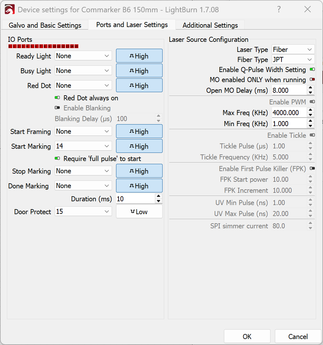 Port- und Laser-Einstellungen für ComMarker B6 mit 150mm Linse